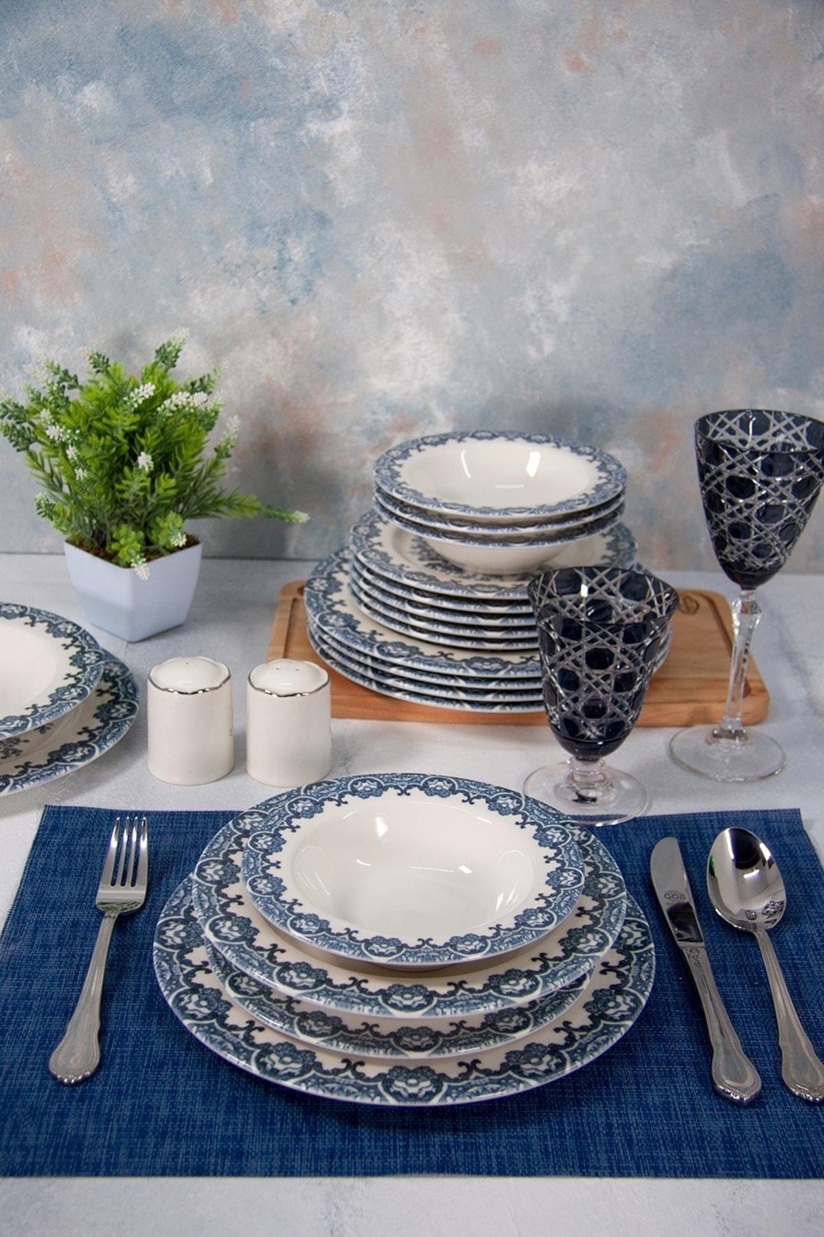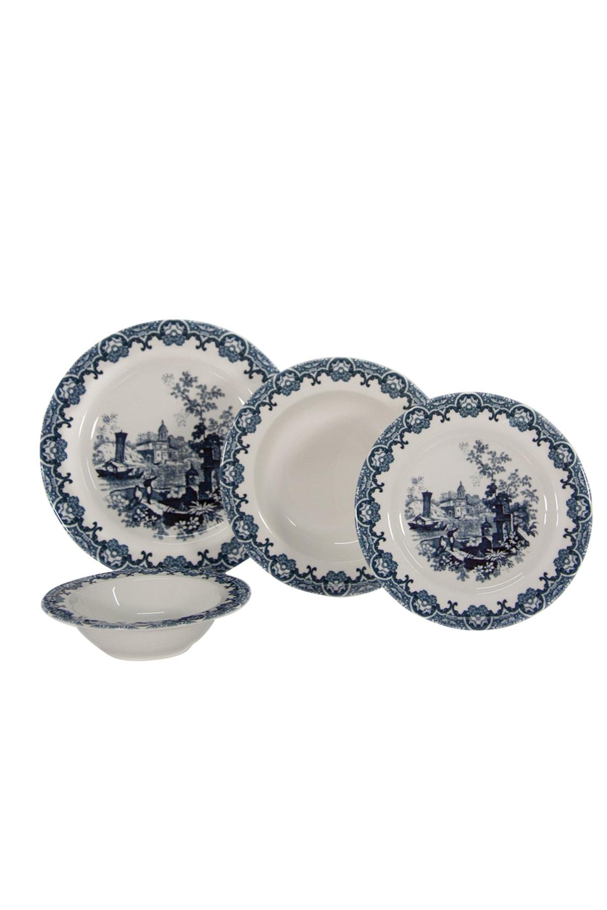 6 Kişilik 24 Parça Porselen Yemek Takımı - Castle; 6 adet servis tabağı - 27cm; 6 adet tatlı tabağı - 21cm; 6 adet çukur yemek tabağı - 23cm; 6 adet çorba kasesi - 12cm; Porselenden üretilmiştir; Castle porselen yemek takımı paket içeriğinde toplam 24 parça ürün bulunmaktadır. 6 kişilik servisler için uygundur; Bulaşık makinesinde hassas programda ya da sert temizlik malzemeleri kullanılmadan elde yıkanmalıdır; Mikrodalgada kullanıma uygun değildir.