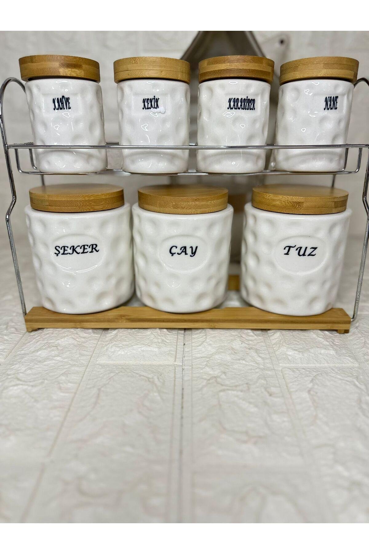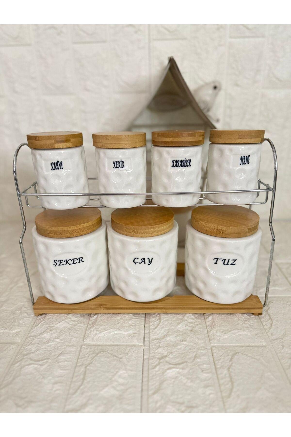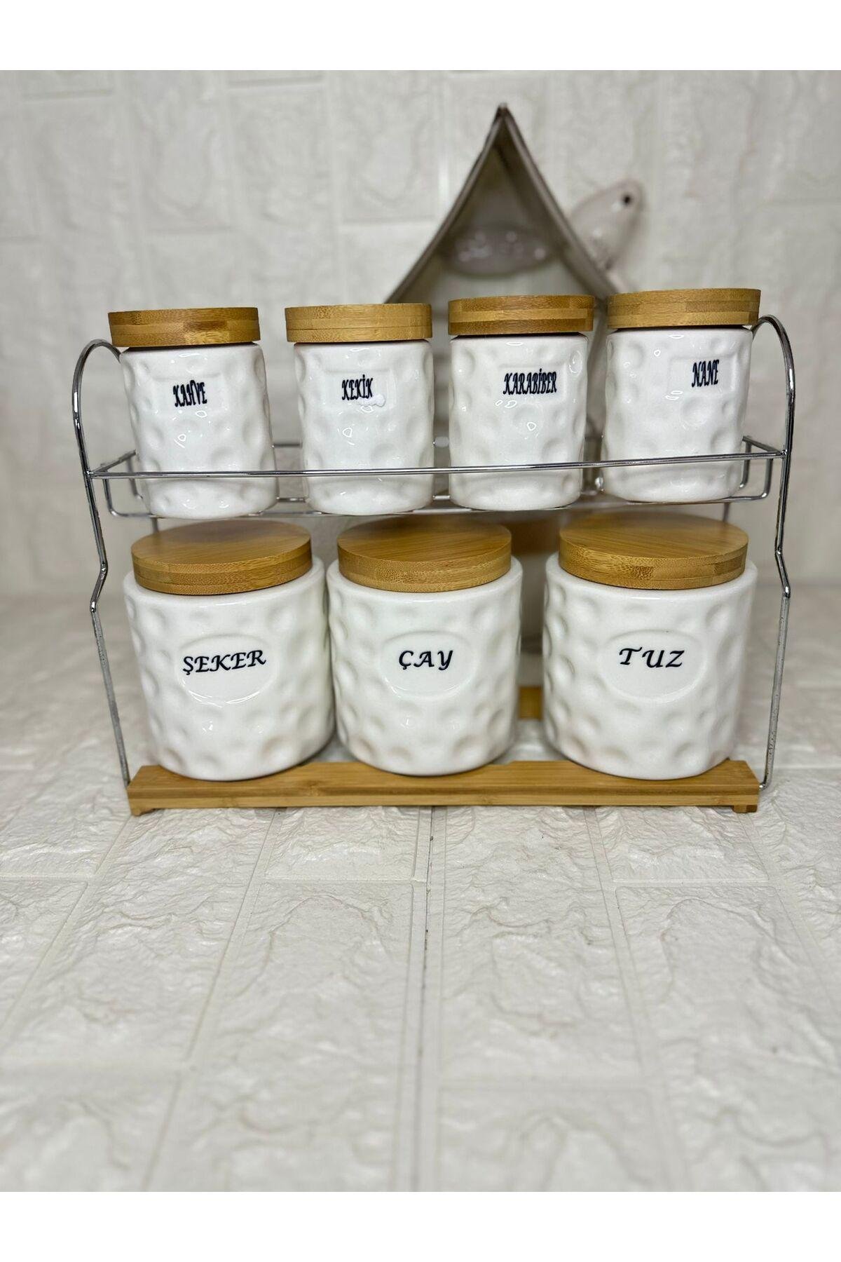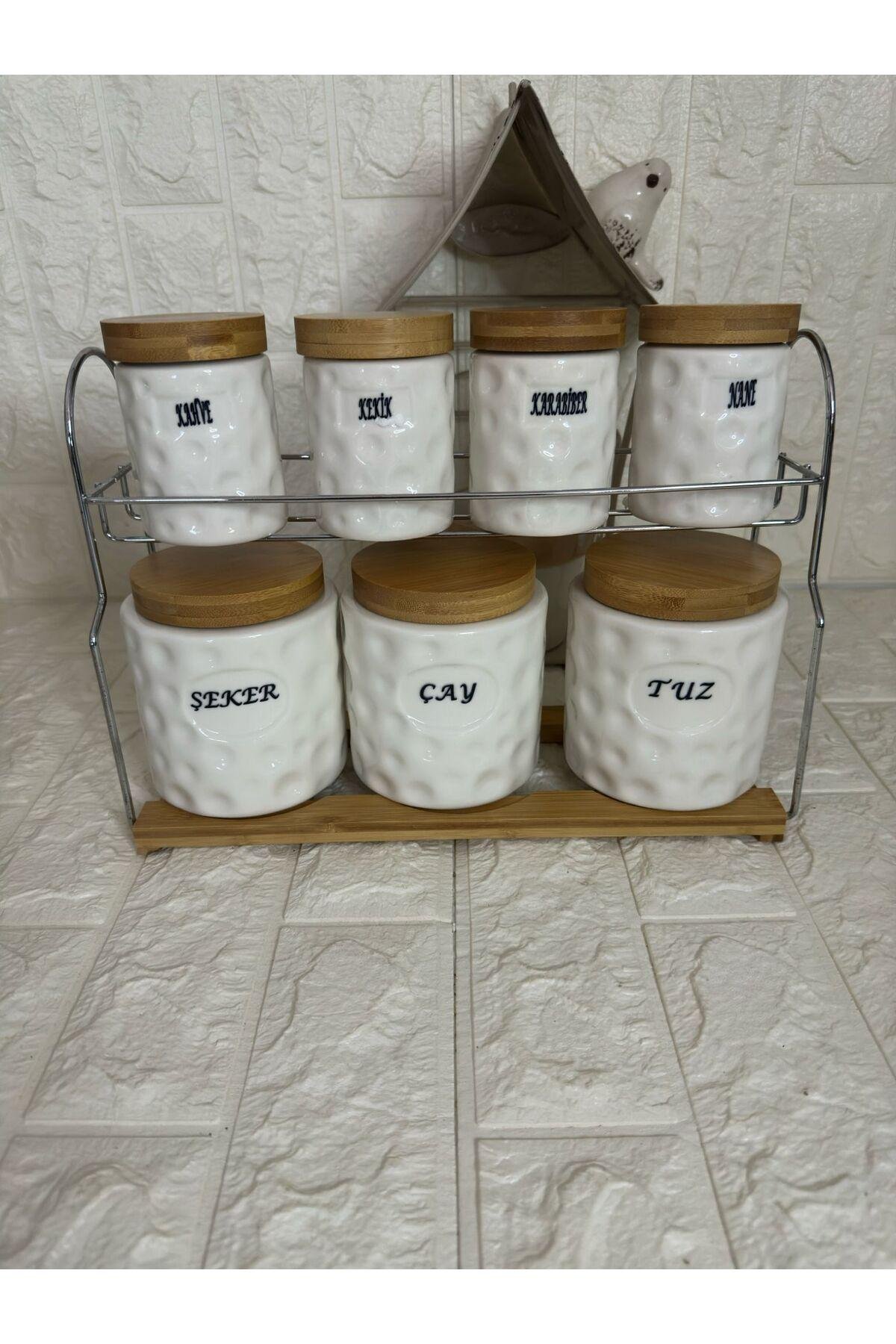 - 7 parçadan oluşan set, mutfakta ihtiyacınız olan her şeyi tek bir yerde toplar.; - 635 ml hacmiyle geniş kapasite sunarak baharatlarınızı düzenli ve kolayca saklamanızı sağlar.; - Porselen malzemesi sayesinde dayanıklılık ve şık görünüm bir arada bulunur; uzun süreli kullanım için idealdir.; - Vakumlu kapak tasarımı ile baharatlarınızın tazeliğini korurken, bambu stand üzerindeki pratik kullanım avantajını yaşatır.; - ; stant en 33 boy 24 cm ; baharatlıklar ölçü; küçük boy 9 x6.5 cm ; büyük boy 12x10 cm ;