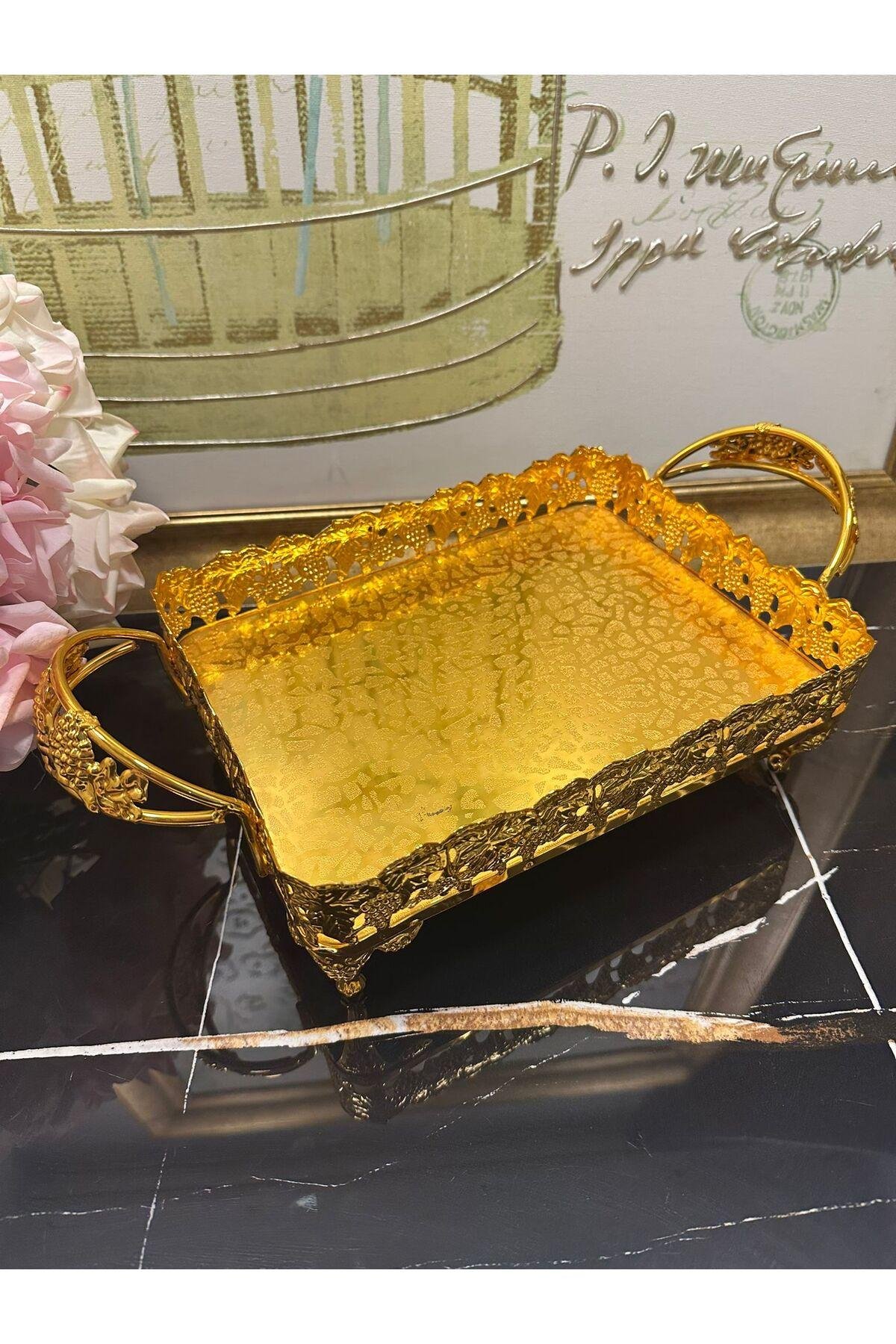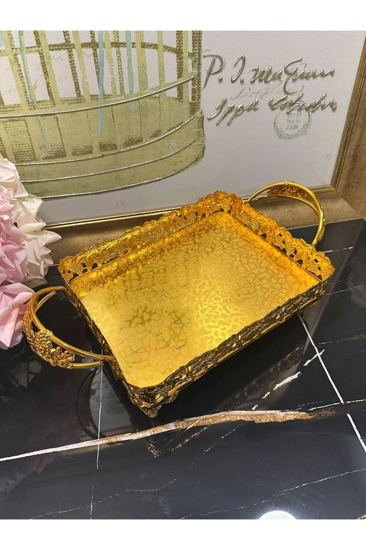 - Altın rengindeki zarif tasarımıyla her türlü davet ve özel günlerde şıklığınızı tamamlar.; - 26x20x9 cm boyutlarındaki bu dikdörtgen tepsi, geniş kullanım alanı sunarak sofralarınıza estetik bir dokunuş katar.; - Tek parça halinde gelen bu altın tepsinin kolay temizlenebilir yapısı sayesinde pratik kullanım sağlar.; - Materyali altın olan bu ürün, dayanıklılığı ve parlak görünümü ile uzun süreli kullanım vaat eder.