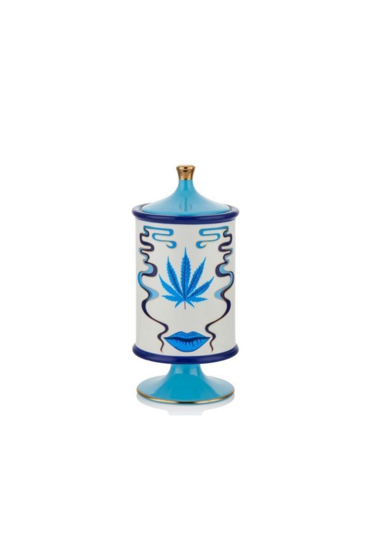 Blue eye mavı beyaz yaprak detaylı kapaklı vazo 11,2*11,2*24,8 cm