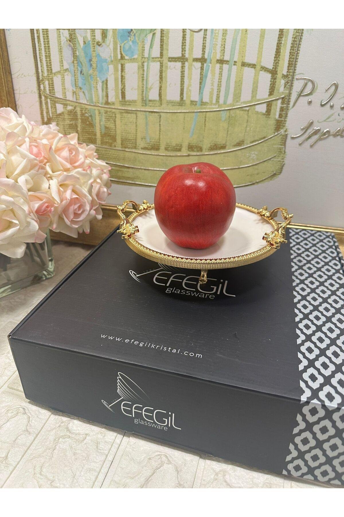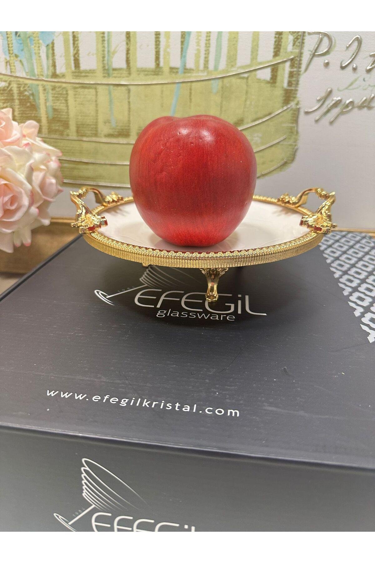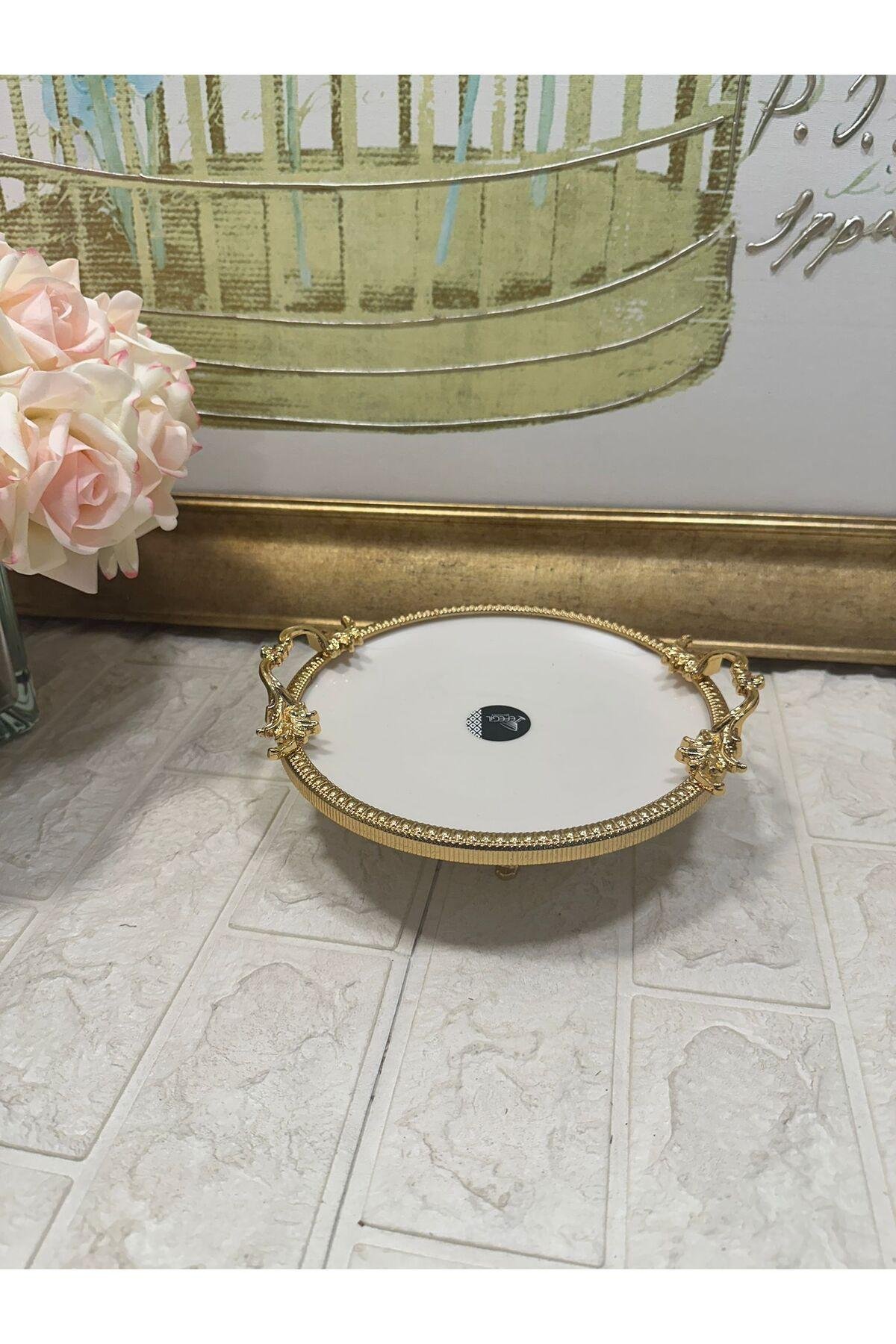 - Klasik tasarımıyla her türlü sofra düzenine uyum sağlayan gold kulplu porselen sunumluk, şıklığı ve zarafeti masanıza taşır.; - Türkiye'de üretilen bu ürün, yerel malzemelerle elde edilen kaliteyi yansıtır ve dayanıklılığı ile öne çıkar.; - Tek parça halinde gelen bu sunumluk, kolayca temizlenebilir yapısıyla pratik kullanım sunar.; - Cam materyali sayesinde yiyeceklerinizi sergilemenize olanak tanırken, 21x25 cm boyutlarındaki geniş yüzeyiyle çeşitli servis ihtiyaçlarınıza cevap verir.; - Yuvarlak şekliyle modern ve klasik çizgileri harmanlayan bu sunumluk, sofralarınıza estetik bir dokunuş ekler.