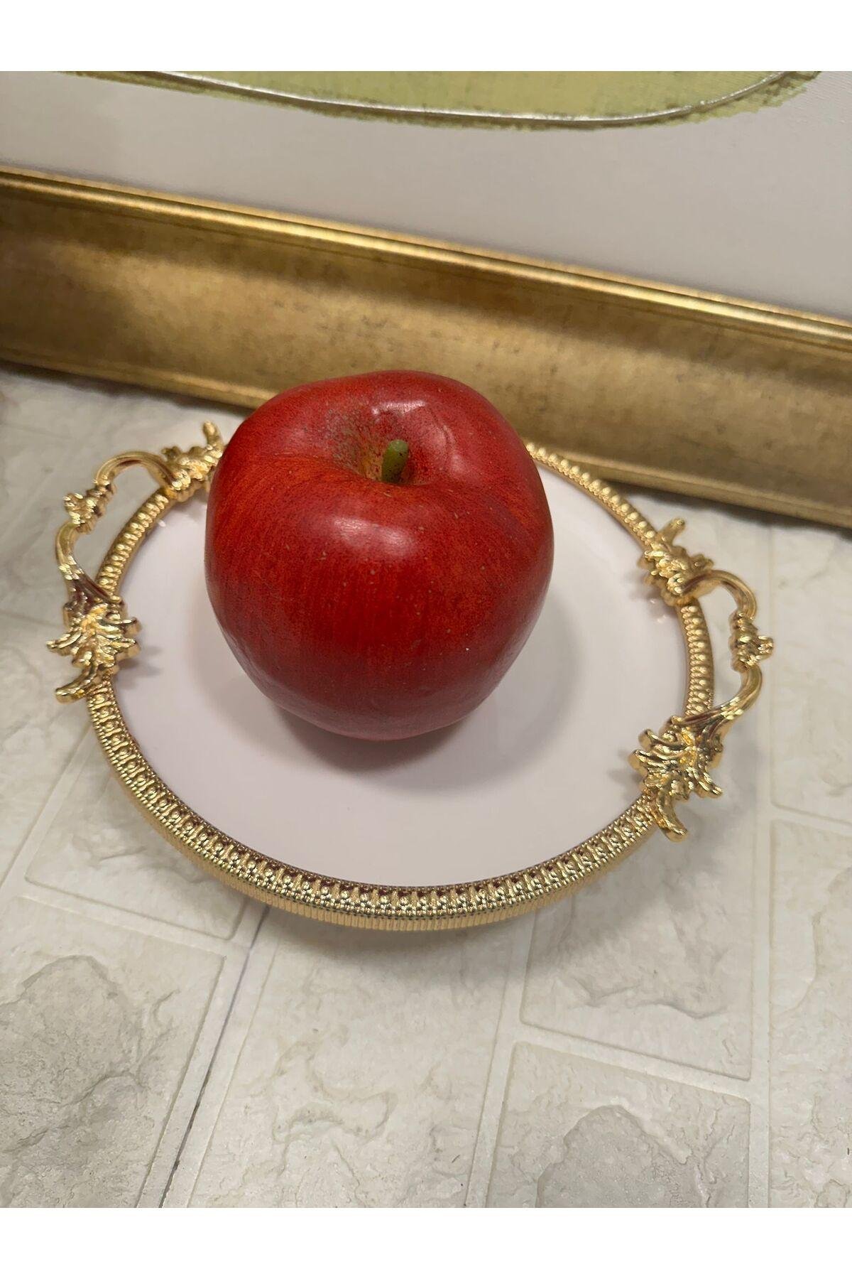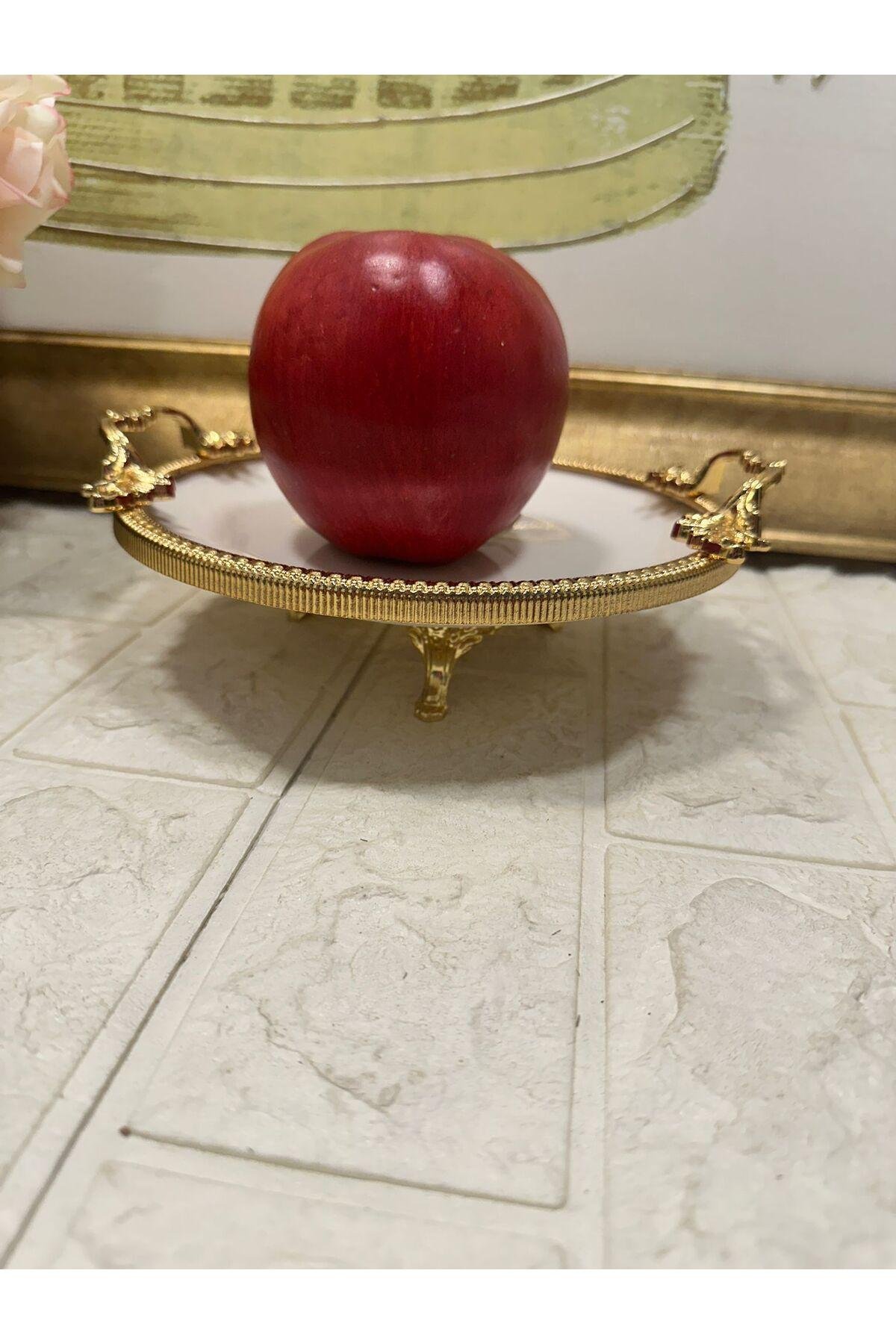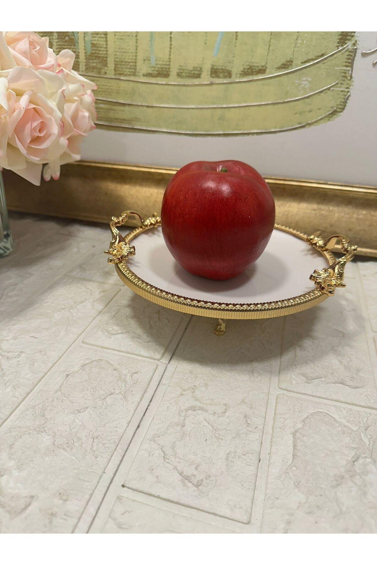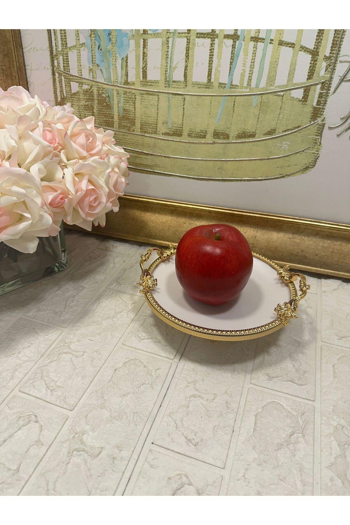- Klasik tasarımıyla her türlü sofra düzenine uyum sağlayan gold kulplu porselen sunumluk, şıklığı ve zarafeti masanıza taşır.; - Türkiye'de üretilen bu ürün, yerel malzemelerle elde edilen kaliteyi yansıtır ve dayanıklılığı ile öne çıkar.; - Tek parça halinde gelen bu sunumluk, kolayca temizlenebilir yapısıyla pratik kullanım sunar.; - Cam materyali sayesinde yiyeceklerinizi sergilemenize olanak tanırken, 21x25 cm boyutlarındaki geniş yüzeyiyle çeşitli servis ihtiyaçlarınıza cevap verir.; - Yuvarlak şekliyle modern ve klasik çizgileri harmanlayan bu sunumluk, sofralarınıza estetik bir dokunuş ekler.