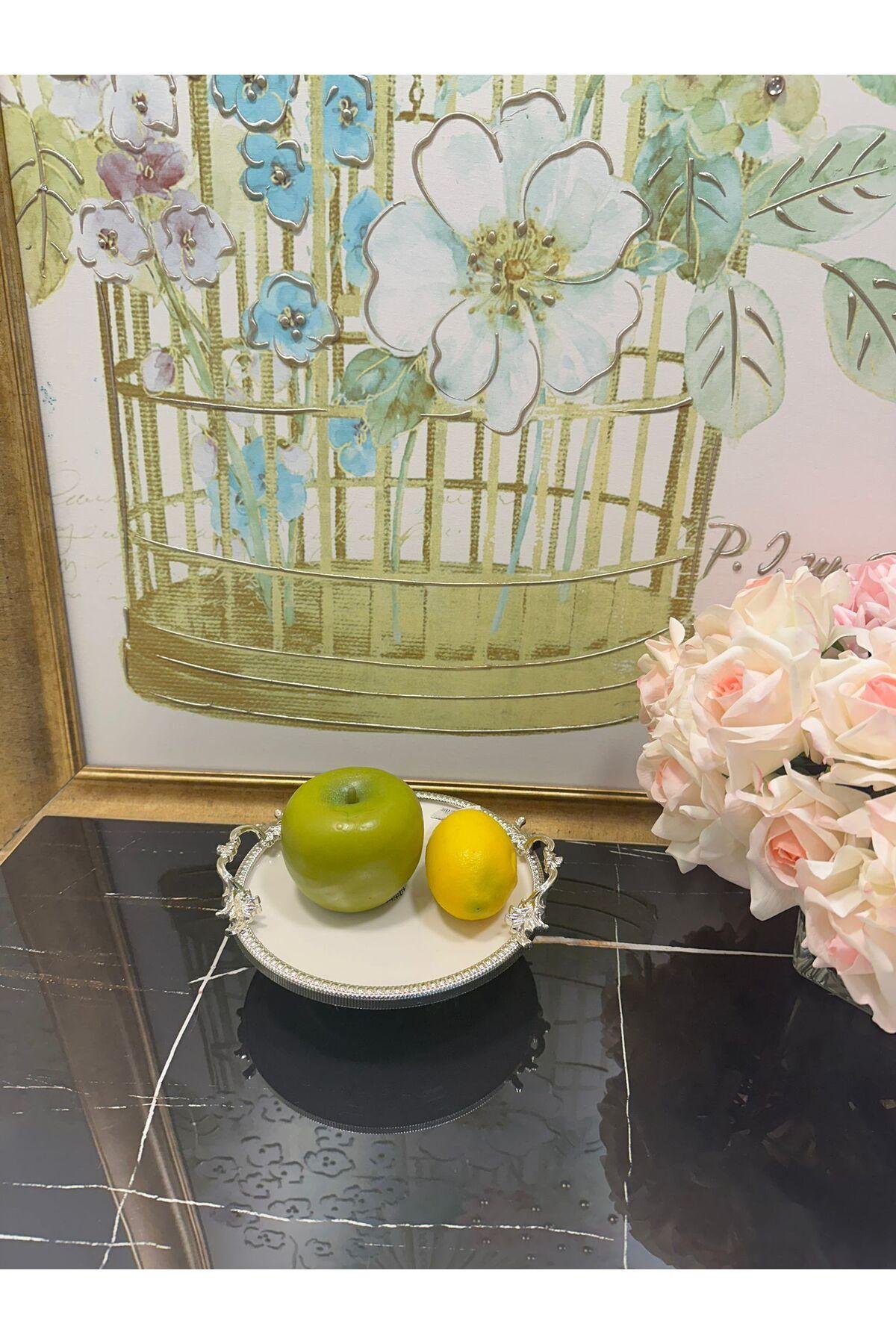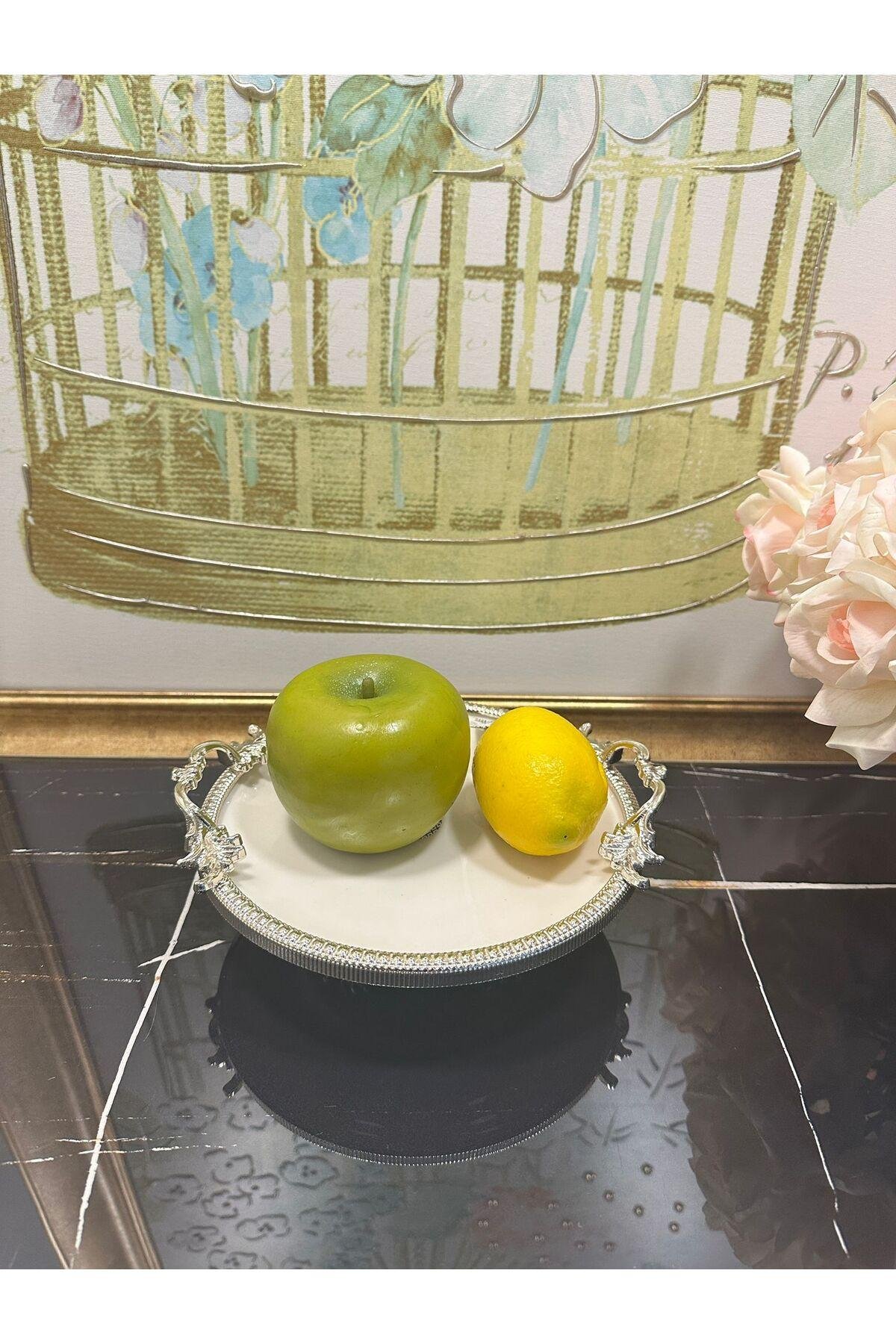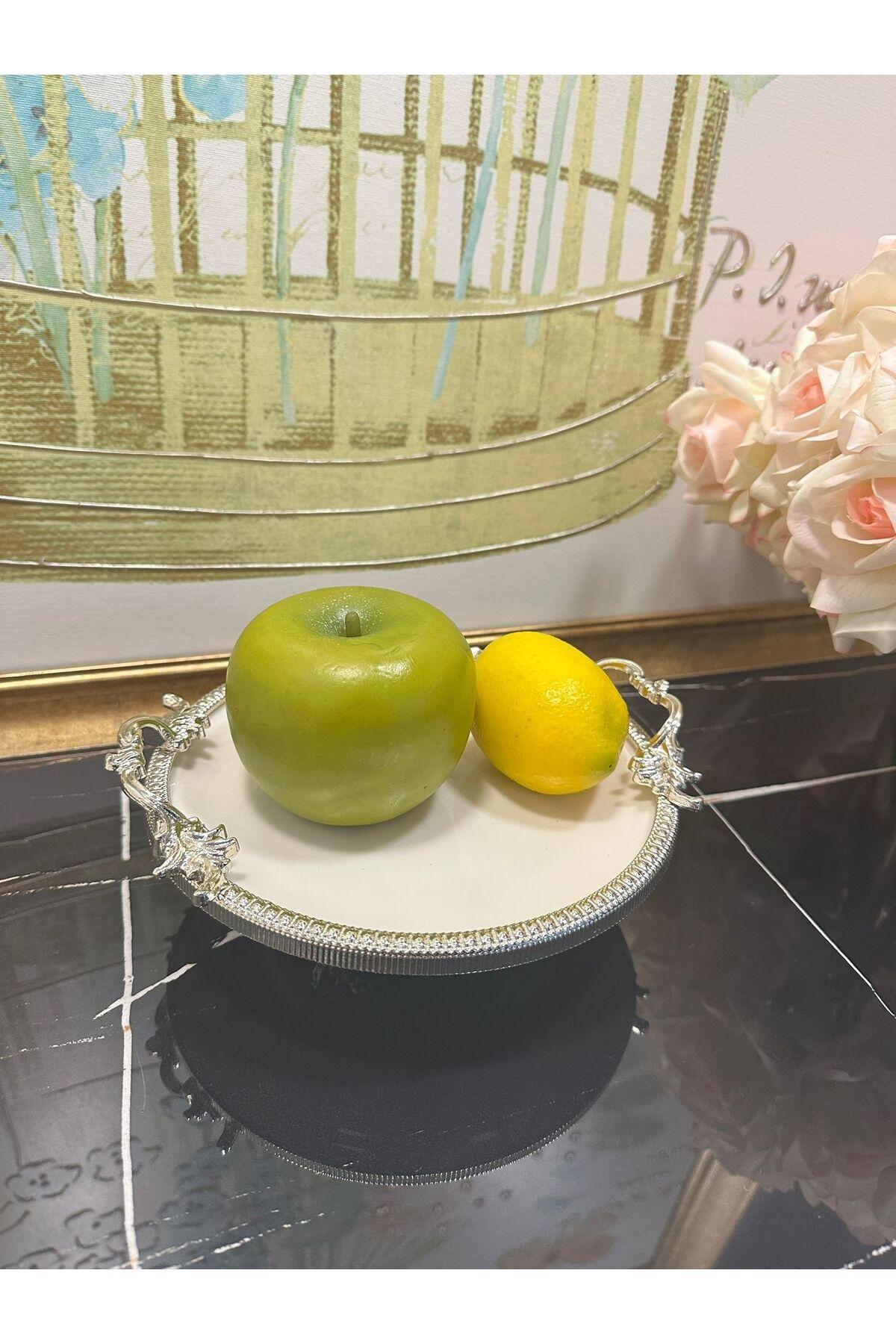 - Klasik tasarımıyla her türlü sofra düzenine uyum sağlayan gümüş kulplu porselen sunumluk, şıklığı ve zarafeti masanıza taşır.; - 21 cm çapında ve 8 cm yüksekliğindeki bu sunumluk, ideal boyutlarıyla hem servislerinizi kolaylaştırır hem de estetik bir görünüm sunar.; - Yuvarlak formu sayesinde çeşitli yiyecekleri sergilemek için mükemmel bir seçenektir; meze tabağı veya garnitür olarak kullanılabilir.; - Dayanıklı porselen malzemesi ile uzun ömürlü kullanım vaat ederken, kolay temizlenebilir yapısı pratiklik sağlar.; - Türkiye'de üretilmiş olup yerel kaynaklı malzemelerle kalite standartlarına uygun şekilde hazırlanmıştır.