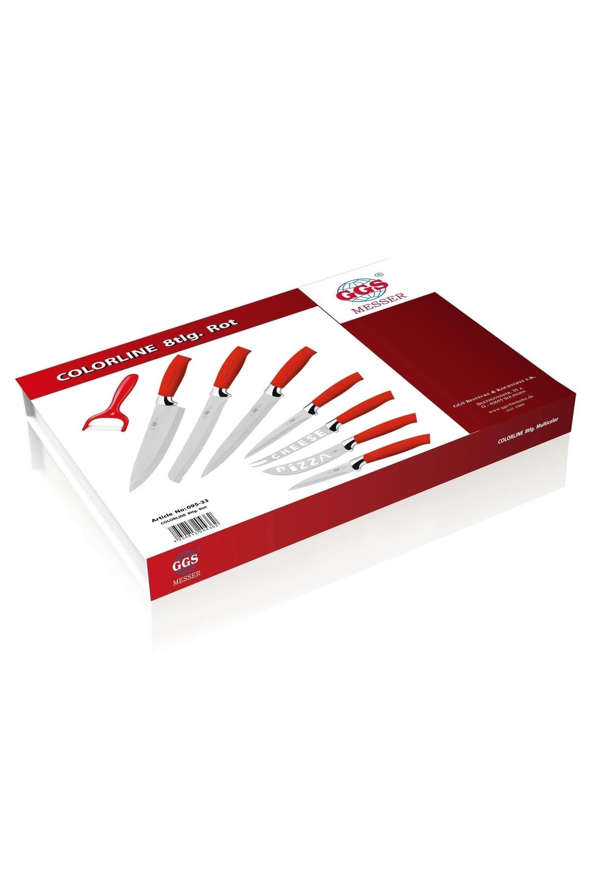 GGS Messer Colorline Bıçak Seti 8 Parça SLN2109Ağızları Paslanmaz Çelikten Yapılmıştır; Ürün Bilgileri: 1 Adet Şef Bıçağı, Bıçak Uzunluğu 20cm, Toplam Uzunluk 33cm 1 Adet Ekmek Bıçağı, Bıçak Uzunluğu 20cm, Toplam Uzunluk 33cm 1 Adet Et Bıçağı, Bıçak Uzunluğu 20cm, Toplam Uzunluk 33cm 1 Adet Evrensel Bıçak, Bıçak Uzunluk 12cm, Toplam Uzunluk 24cm 1 Adet Peynir Bıçağı, Bıçak Uzunluğu 12cm, Toplam Uzunluk 23cm 1 Adet Pizza Bıçağı, Bıçak Uzunluğu 11; 5cm, Toplam Uzunluk 22cm 1 Adet Soyma Bıçağı, Bıçak Uzunluğu 8cm, Toplam Uzunluk 19; 5cm 1 Adet Soyucu Toplam Uzunluk 15cm Made in Germany / Solingen GGS Solingen ( Almanya Solingen sehrinden gelmektedir; );