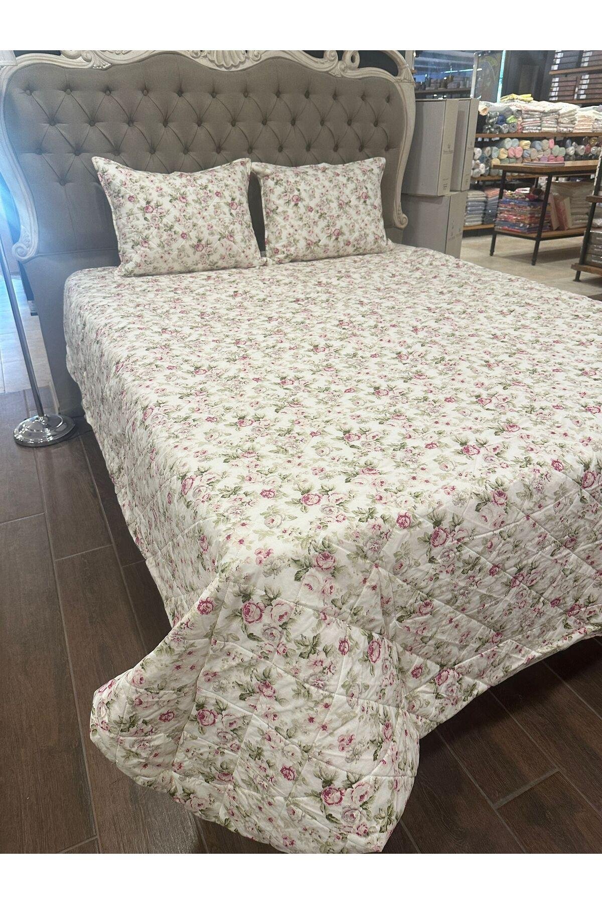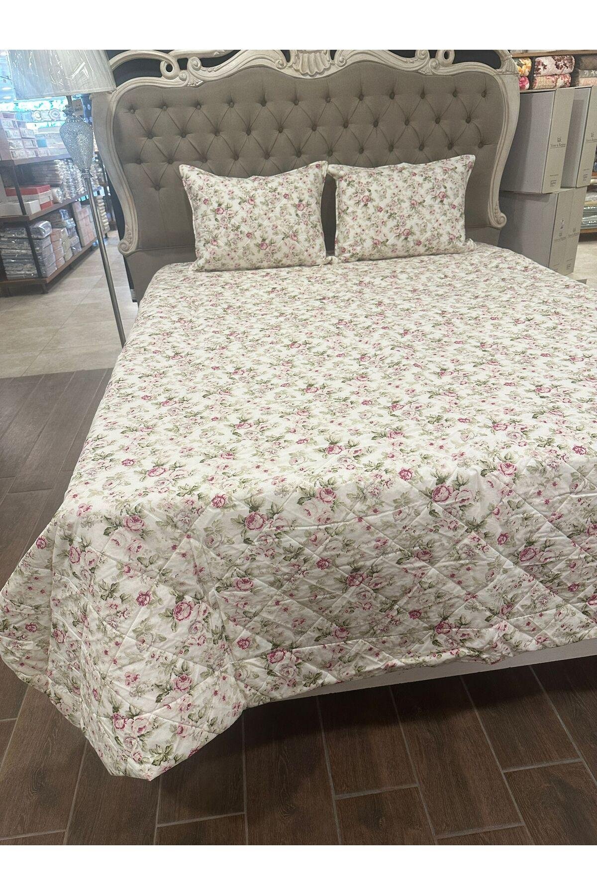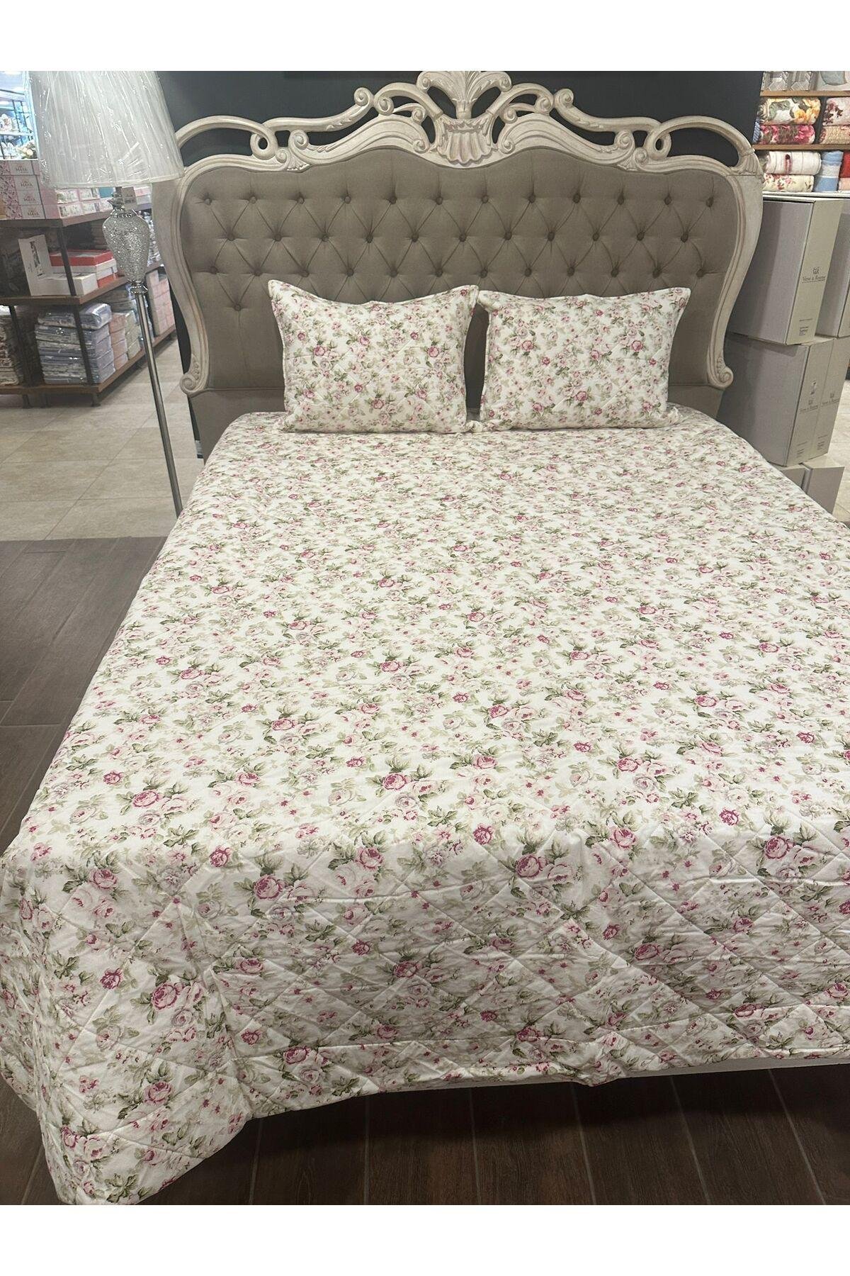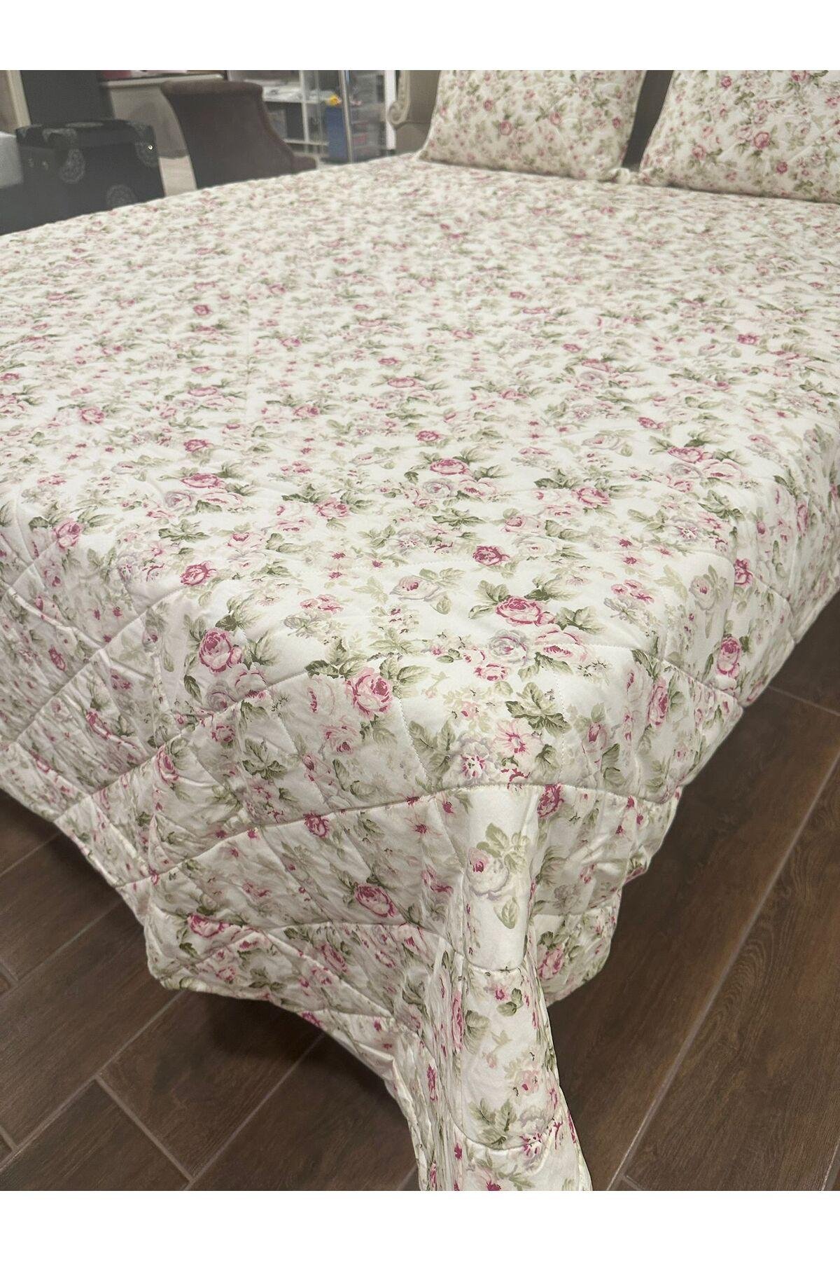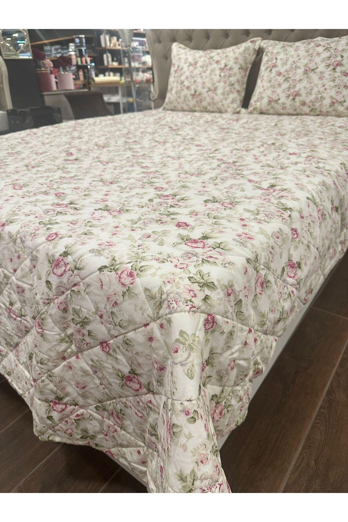 - %100 pamuk materyalden üretilmiş olup, cildinizle doğal ve yumuşak bir temas sağlar.; - 230 x 250 cm boyutlarındaki geniş tasarımı ile geniş yatak alanlarınıza uyum sağlar ve şıklığıyla göz doldurur.; - Solmaya dayanıklı özelliği sayesinde uzun süre ilk günkü canlı renklerini korur; sık yıkamalara karşı dirençlidir.; - Elyaf dolgu materyali ile hafifliği ve konforu bir arada sunar, rahat bir uyku deneyimi vaat eder.; - Çiçek desenleriyle odanızda neşe ve tazelik hissi yaratır; dekoratif detaylarıyla mekanınıza estetik bir dokunuş ekler.; - Çantalı ambalajı sayesinde kolayca saklanabilir veya hediye olarak tercih edilebilir; pratik kullanım sunar.; - Türkiye'de üretilmiştir; yerel kaynakların desteklenmesine katkıda bulunurken kalite standartlarından ödün vermez.; -yastık kılıfları fermuarlıdır