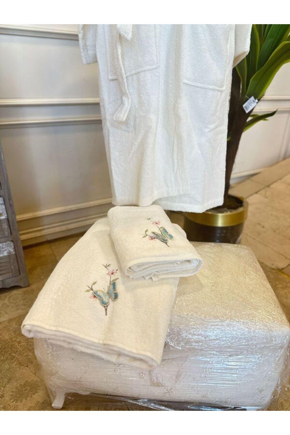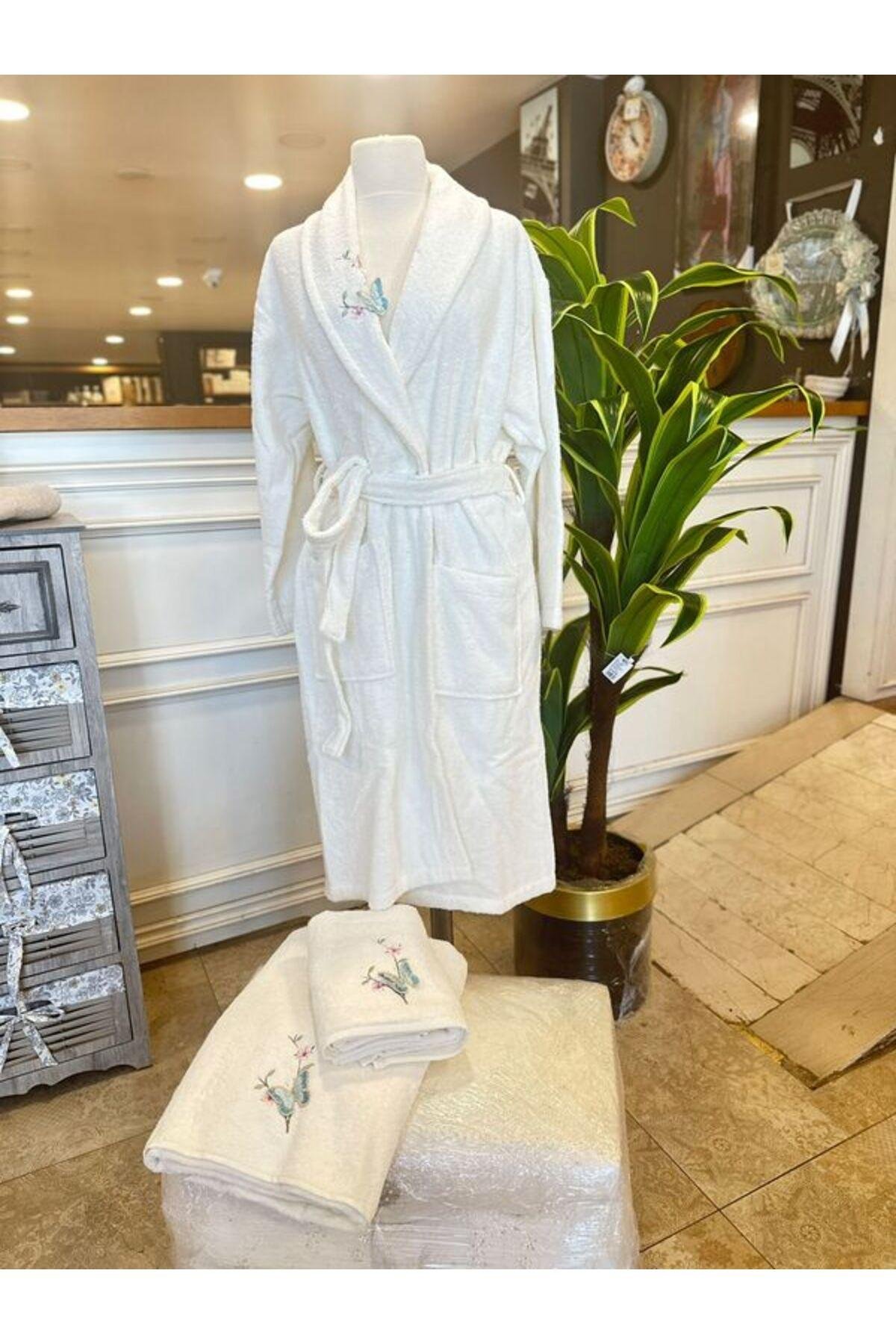Midi boy tasarımı ile rahat hareket etme özgürlüğü sunar ve banyo sonrası konforunuzu artırır; %100 pamuk materyali sayesinde cildinize nazik dokunuşlar sağlar ve doğal bir yumuşaklık sunar; Pamuklu yapısı, nefes alabilir özelliğiyle terlemeyi minimize eder ve tüm gün rahat bir kullanım imkanı tanır; Kelebek nakış detayları ile şıklığı ve zarafeti banyo rutininize taşır, estetik bir görünüm kazandırır; Set halinde sunulan bu bornoz takımı, hem pratik hem de şık bir banyo deneyimi için idealdir;