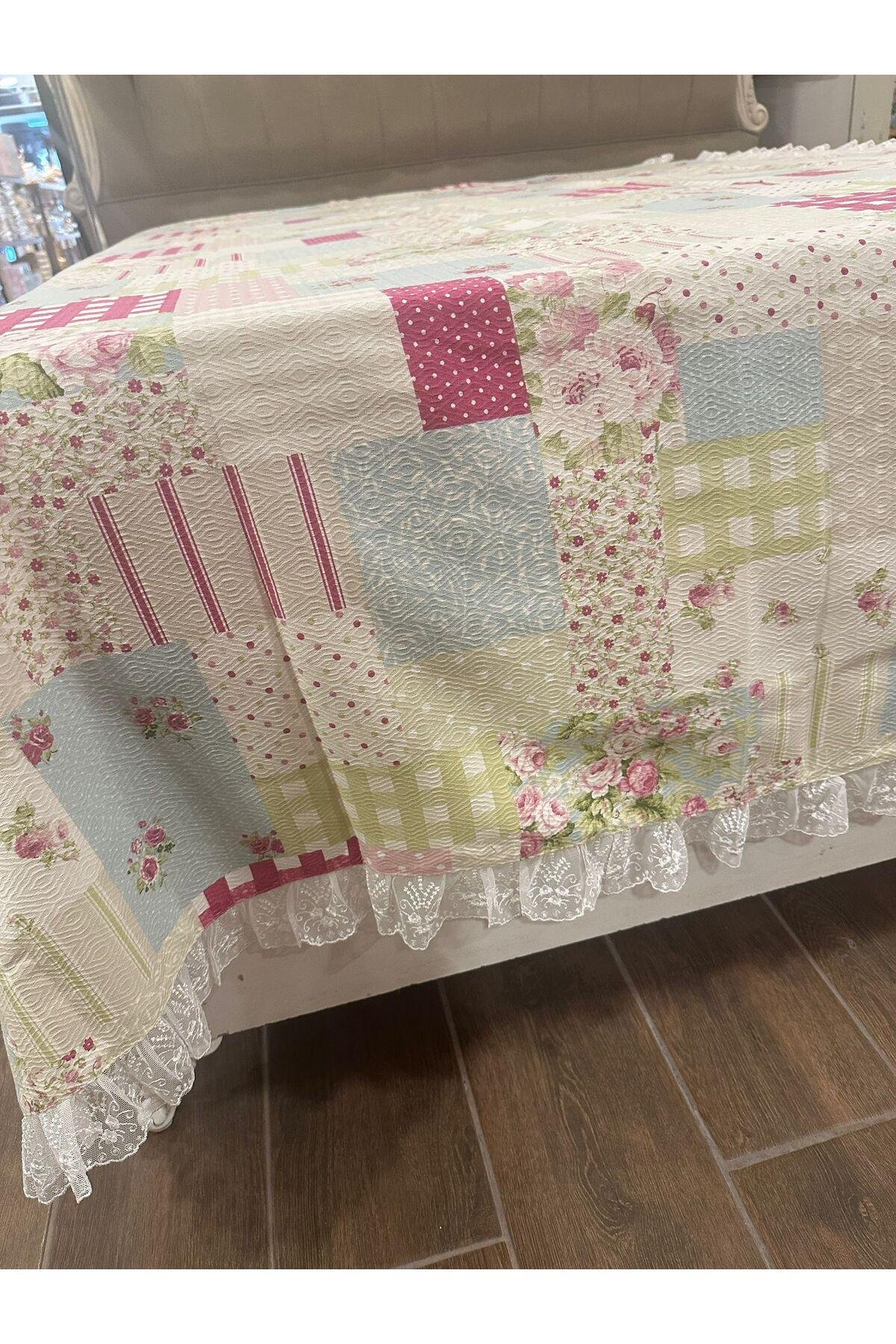 - %100 pamuk materyali ile üretilmiş, cildinize nazik dokunuşlar sunan Patchwork Pike Yatak Örtüsü.; - Çift kişilik boyutlarıyla geniş ve rahat bir kullanım alanı sağlar; 150 x 230 cm ölçülerindeki bu örtü, konforlu bir uyku deneyimi vadediyor.; - Geometrik desenleriyle modern ve şık bir görünüm kazandırırken, dantel detayları ile estetik bir dokunuş ekler.; - Pamukun doğal nefes alabilir yapısı sayesinde tüm mevsimlerde ideal sıcaklıkta uyumanızı sağlar.; - Çarşafsız tasarımıyla pratik kullanım imkanı sunarken, kolayca değiştirilebilir ve bakımı yapılabilir.; - Çok renkli seçenekleriyle dekorasyonunuza canlılık katarak odanızın atmosferini zenginleştirir.; - 30 derecede yıkama talimatına uygun şekilde temizlenebilir; böylece hijyenik kalmasını sağlayarak uzun süreli kullanım için idealdir.; - Kutusuz paketi sayesinde ekstra depolama alanından tasarruf etmenizi sağlar ve minimalist bir yaklaşım sergiler.