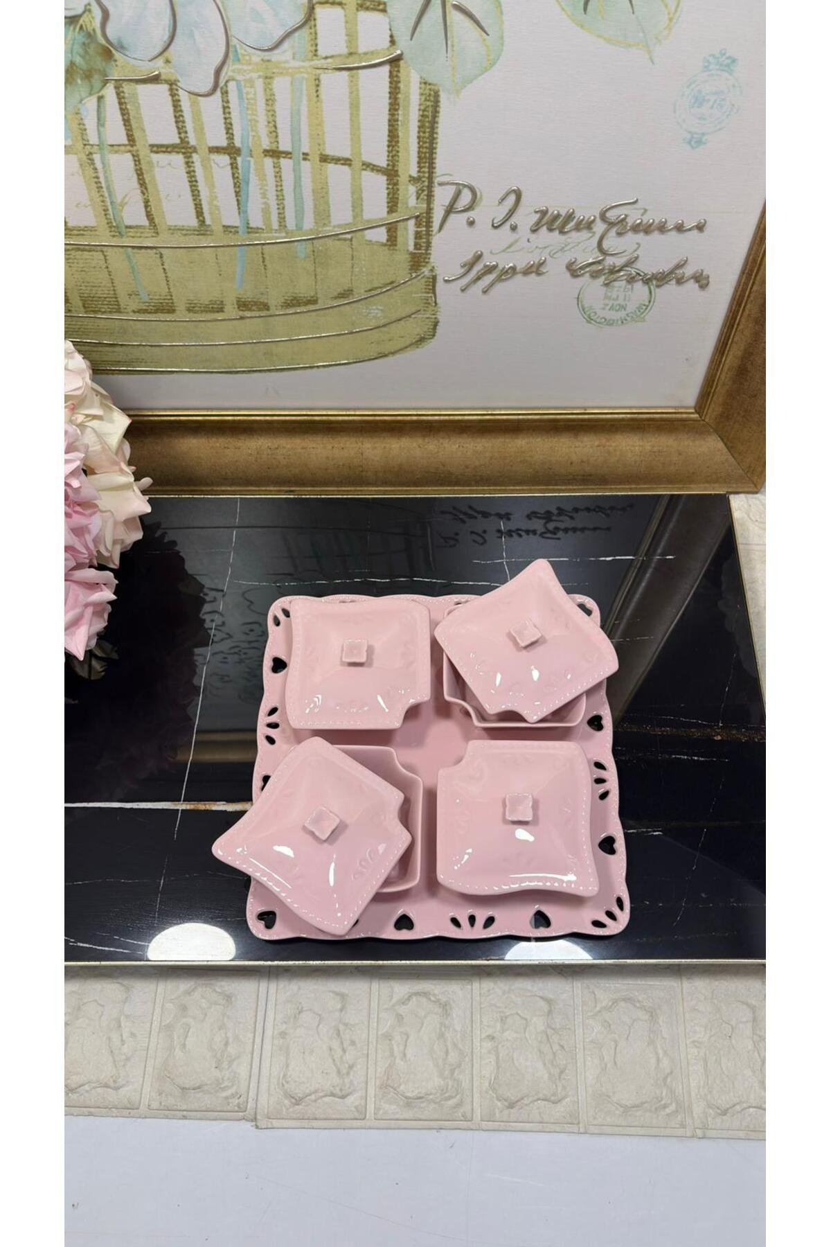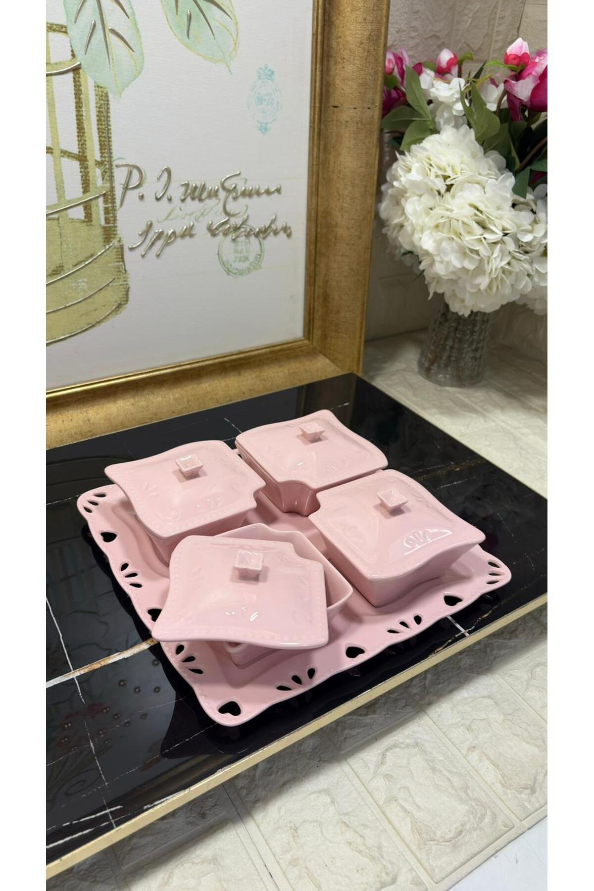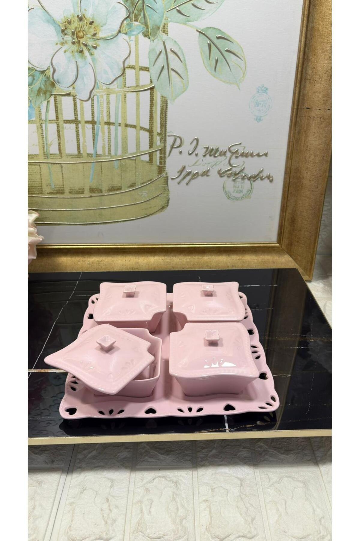 - Güvenli gıda temasına uygun olarak tasarlanmıştır, böylece kahvaltılarınızda porselenin zarafetiyle sağlıklı beslenmenizin keyfini çıkarabilirsiniz.; - Yüksek kaliteli porselen malzemesi sayesinde uzun ömürlü kullanım sunar ve mutfak dekorasyonunuza şık bir dokunuş ekler.; - Bakımı kolaydır; temizliği pratiktir ve dayanıklılığıyla ön plana çıkar.; - Çin menşeli bu ürün, yerel üretimden gelen zengin kültürel mirası evinizde sergilemenize olanak tanır.; - Set içerisindeki parçalar toplamda 9 adet olup, çeşitli ihtiyaçlarınıza uyum sağlayacak şekilde geniş bir kullanım alanı sunar.; sunum tabağı 1 adet 4 adet kahvaltı tabağı ve kapağı - büyük tabak 27x27 cm -1 adet - kahvaltı tabakları 10x10xx5 cm - 4 adet