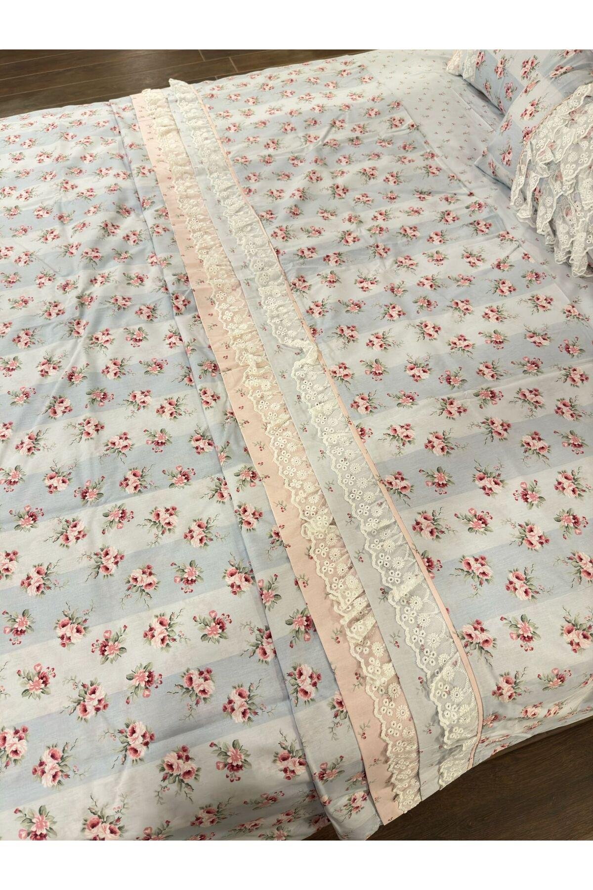 - %100 pamuklu kumaşı ile cildinize nefes aldıran ve doğal bir yumuşaklık sunan çift kişilik nevresim takımı.; - Lastiksiz tasarımı sayesinde kolayca yatağınıza uyum sağlar ve pratik kullanım imkanı tanır.; - Çiçek desenleriyle odanızda bahar esintisi yaratırken, mavi renk tonuyla huzurlu bir atmosfer oluşturur.; - özelliği ile hijyenik bir uyku ortamı sağlar; alerjenlere karşı ekstra koruma sunar.; - 160 x 235 cm boyutlarındaki geniş yapısıyla rahatça kullanabileceğiniz ideal ebatlarda üretilmiştir.; - Kolay bakım avantajına sahip olan bu nevresim setini yıkarken Type 1 yıkama talimatlarına uyma konusunda endişelenmenize gerek yoktur.; - Pamuklu materyali sayesinde uzun süreli dayanıklılık vaad ederken aynı zamanda yumuşak dokusuyla konforunuzu artırır.