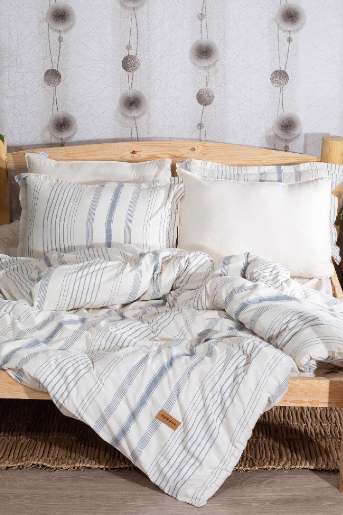 - %100 pamuk materyali ile üretilmiş, cildinize nefes aldıran ve doğal bir uyku deneyimi sunan çift kişilik nevresim takımı.; - Lacivert rengiyle modern ve şık bir görünüm kazandırırken, çizgili deseniyle yatak odanızda zarif bir dokunuş sağlar.; - Lastiksiz çarşaf tasarımı sayesinde yatağınıza mükemmel uyum sağlar ve rahat bir kullanım sunar.; - Kolay bakım avantajıyla pratik temizlik imkanı tanır; makinede yıkanabilir özelliğiyle zamandan tasarruf ederken hijyenik kalmanızı destekler.