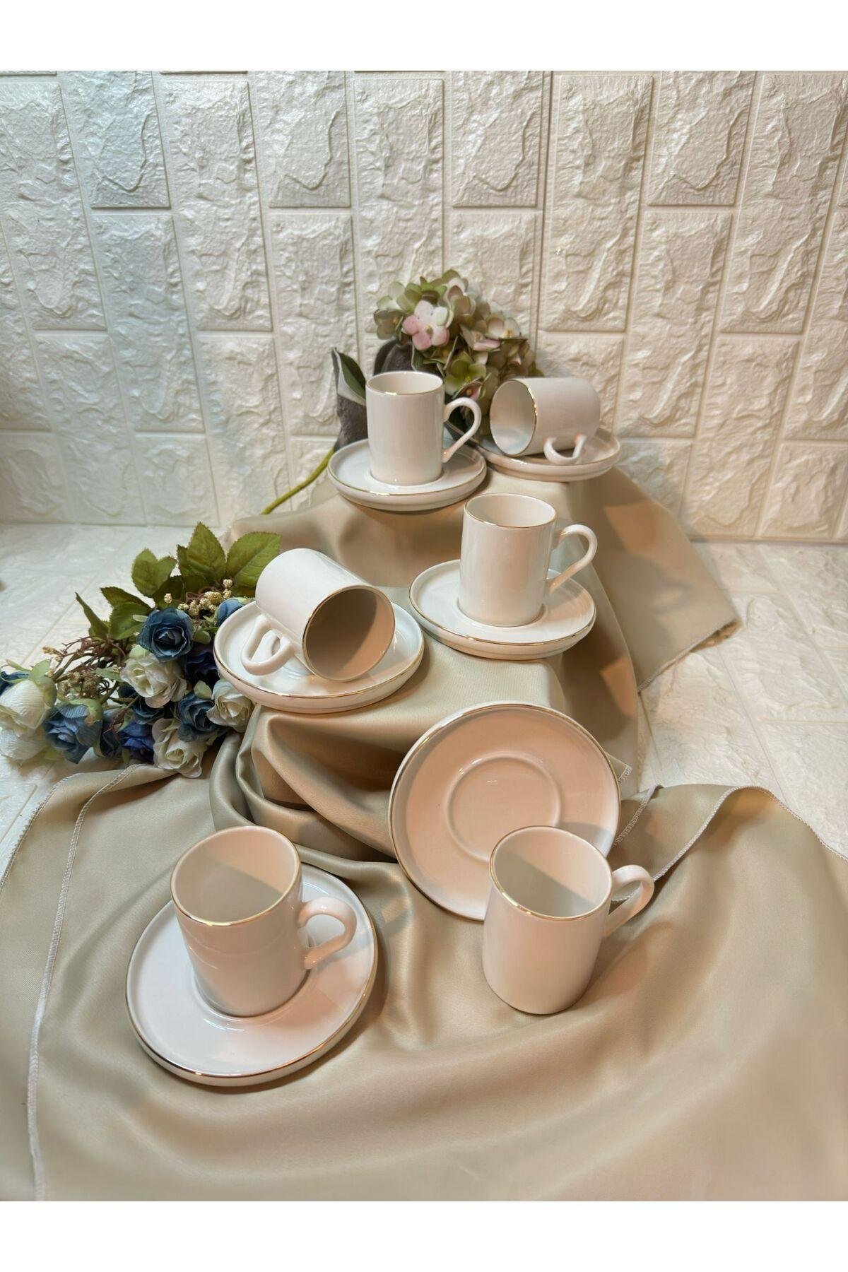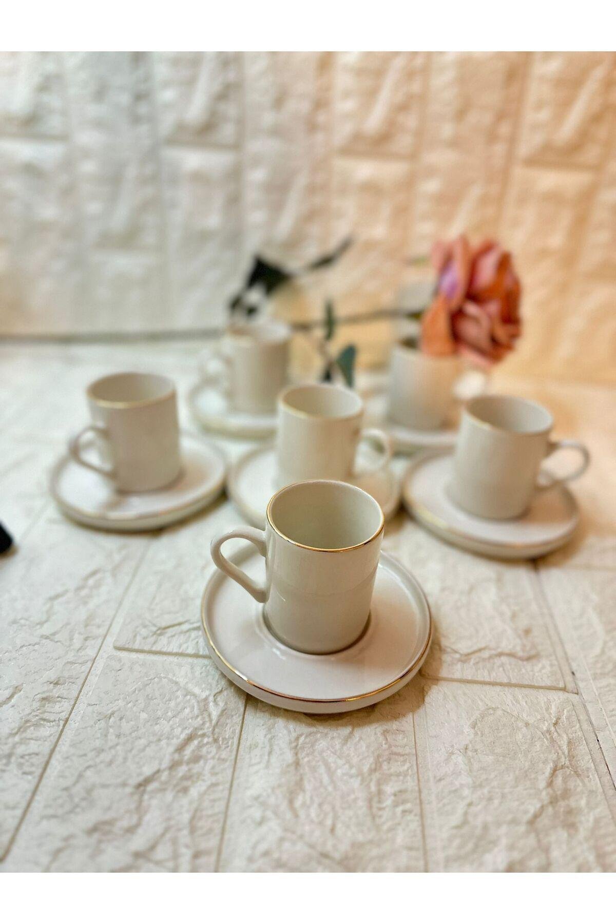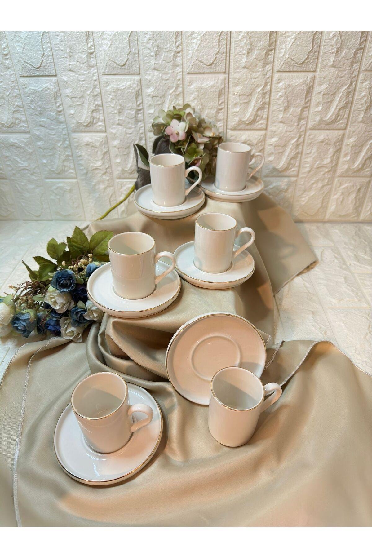 Porselen malzemesi sayesinde uzun ömürlü ve dayanıklı kullanım sunar; Modern tasarımı ile mutfak dekorasyonunuza şık bir dokunuş katar; 6 kişilik set, arkadaşlarınız veya ailenizle keyifli kahve sohbetleri için idealdir;