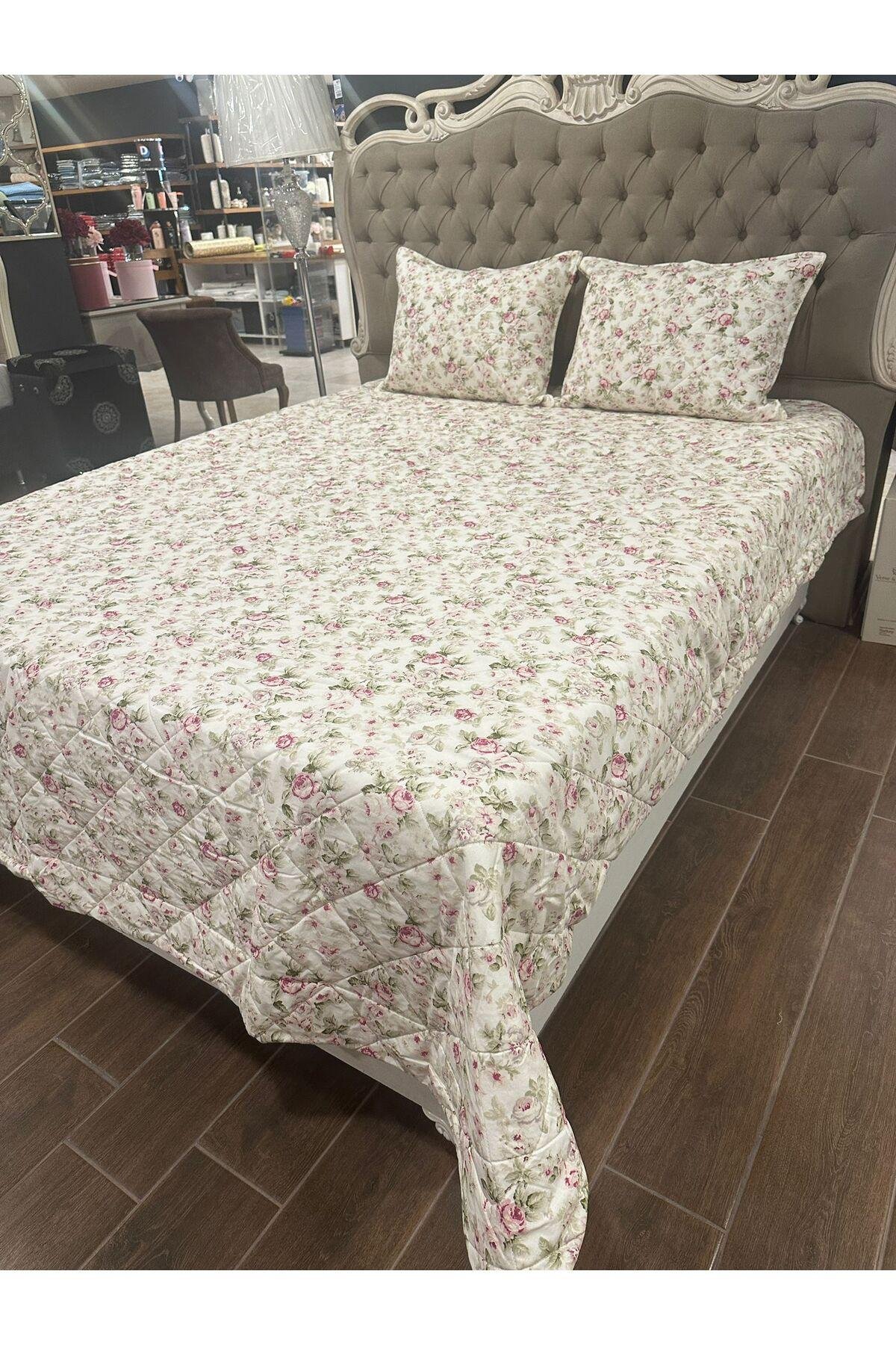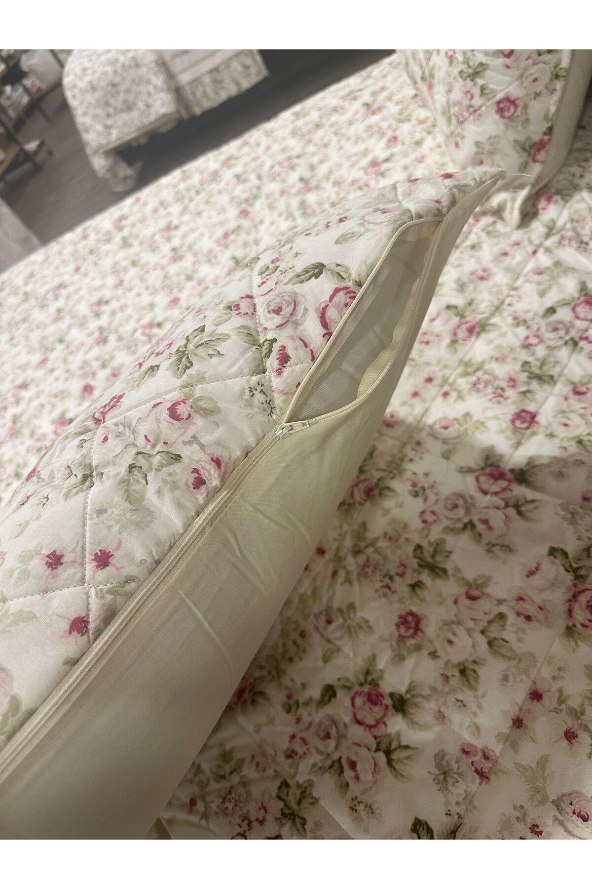 - %100 pamuk materyalden üretilmiş olup, cildinizle doğal ve yumuşak bir temas sağlar.; - 230 x 250 cm boyutlarındaki geniş tasarımı ile geniş yatak alanlarınıza uyum sağlar ve şıklığıyla göz doldurur.; - Solmaya dayanıklı özelliği sayesinde uzun süre ilk günkü canlı renklerini korur; sık yıkamalara karşı dirençlidir.; - Elyaf dolgu materyali ile hafifliği ve konforu bir arada sunar, rahat bir uyku deneyimi vaat eder.; - Çiçek desenleriyle odanızda neşe ve tazelik hissi yaratır; dekoratif detaylarıyla mekanınıza estetik bir dokunuş ekler.; - Çantalı ambalajı sayesinde kolayca saklanabilir veya hediye olarak tercih edilebilir; pratik kullanım sunar.; - Türkiye'de üretilmiştir; yerel kaynakların desteklenmesine katkıda bulunurken kalite standartlarından ödün vermez.; -yastık kılıfları fermuarlıdır
