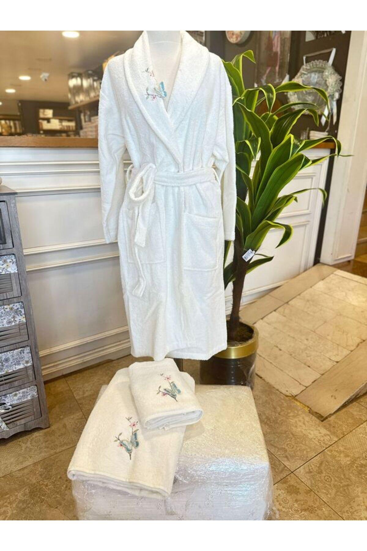 Midi boy tasarımı ile rahat hareket etme özgürlüğü sunar ve banyo sonrası konforunuzu artırır; %100 pamuk materyali sayesinde cildinize nazik dokunuşlar sağlar ve doğal bir yumuşaklık sunar; Pamuklu yapısı, nefes alabilir özelliğiyle terlemeyi minimize eder ve tüm gün rahat bir kullanım imkanı tanır; Kelebek nakış detayları ile şıklığı ve zarafeti banyo rutininize taşır, estetik bir görünüm kazandırır; Set halinde sunulan bu bornoz takımı, hem pratik hem de şık bir banyo deneyimi için idealdir;