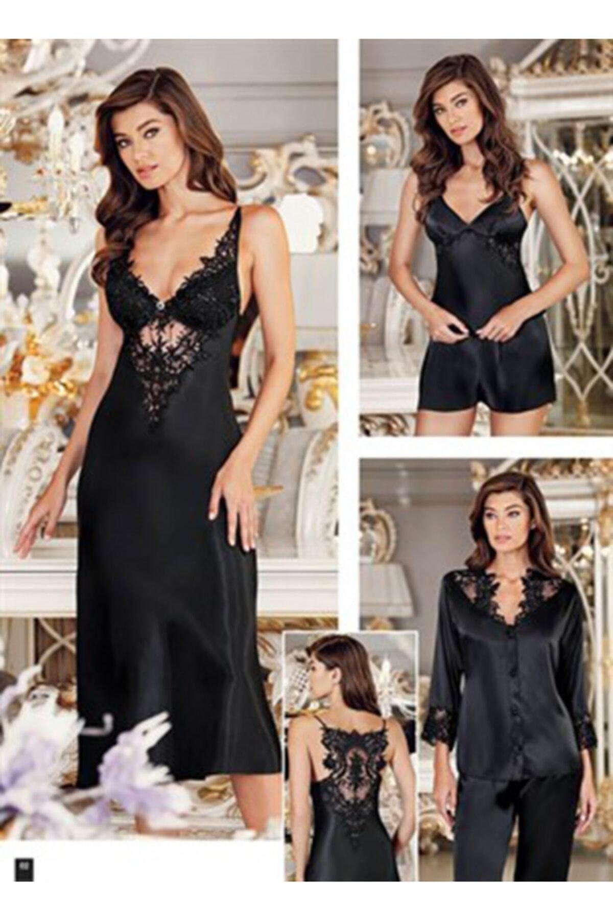Kadın Siyah Saten Uzun Gecelik Sabahlık Takımı